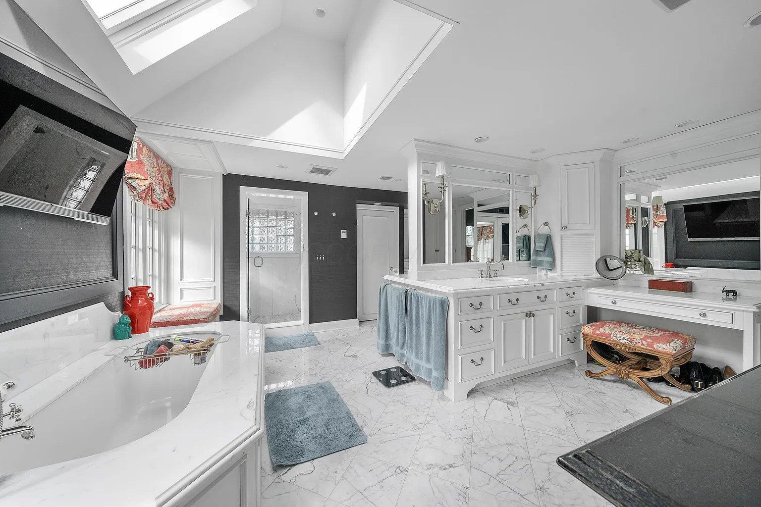A lavish primary bedroom suite enjoys a beautiful marble bathroom. Two sinks with plenty of counter and cabinet space face one another through a wall of mirrors, giving multiple occupants a private space for toiletries. One side expands into a vanity, and warm windows and window seats frame a marble tub. A spacious shower offers privacy, and the entire room is lit by a skylight.