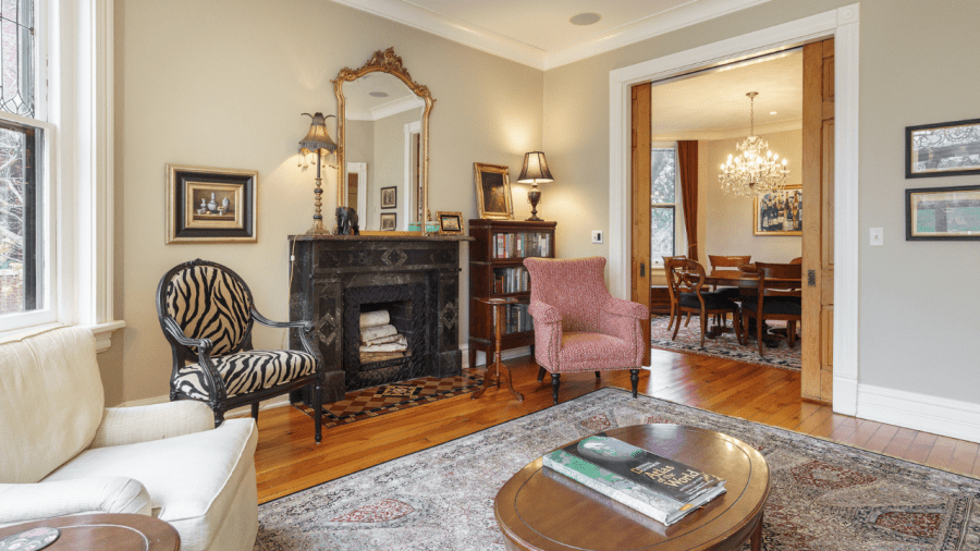 Beyond the front door, a spacious foyer with heart pine wood floors leads to a sitting room featuring a decorative fireplace with an original slate mantle and clear art glass windows with views of Schiller Park. The heart pine wood floors continues into the dining room that includes a chandelier and antique pocket doors.