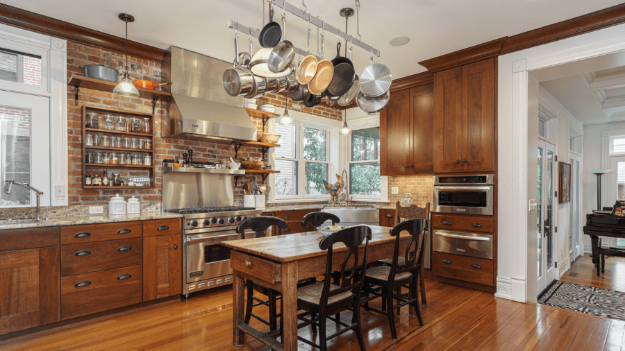 The kitchen is one of several rooms improved after the current owners, who acquired the home in 2011, concluded a $600,000 renovation. Custom cherry cabinetry fills the space with exposed brick walls and a six-burner Viking range. A pantry and a half bathroom can be found just off the kitchen.