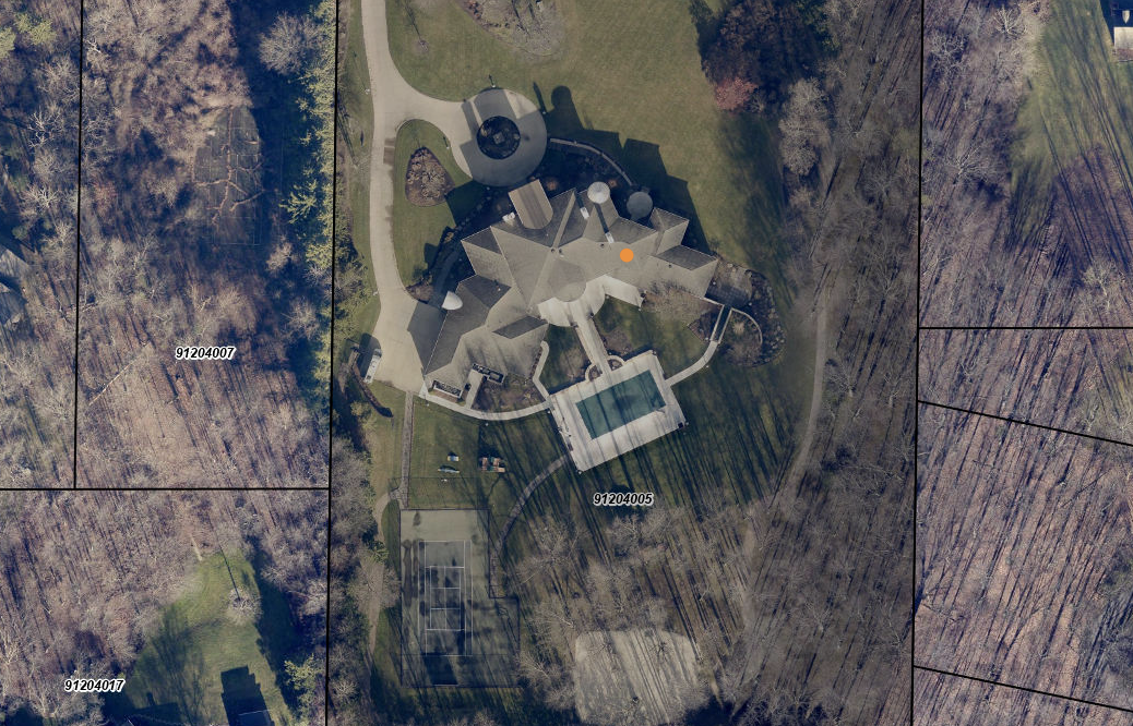 This 16,502-square-foot home was built in 2005 and sits on 6.4 acres. The home features five bedrooms, six full bathrooms, four half bathroom, a tennis court and an expensive outdoor living space with a pool.