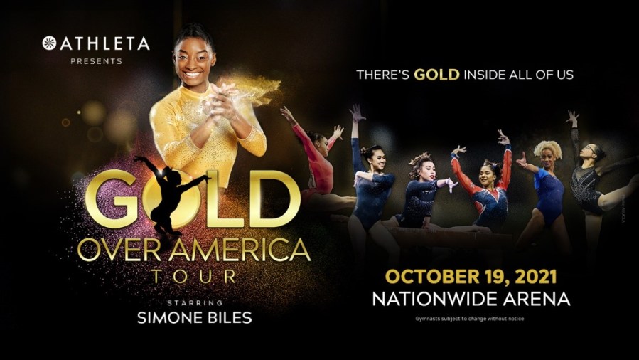 COLUMBUS, Ohio (WCMH) – Fresh off her seventh U.S. title win, four-time Olympic gold medalist and GOAT (greatest of all-time) icon, Simone Biles, is announcing she will star in “Athleta Presents Gold Over America Tour” which is set to arrive in Columbus on Oct. 19, 2021, at Nationwide Arena.