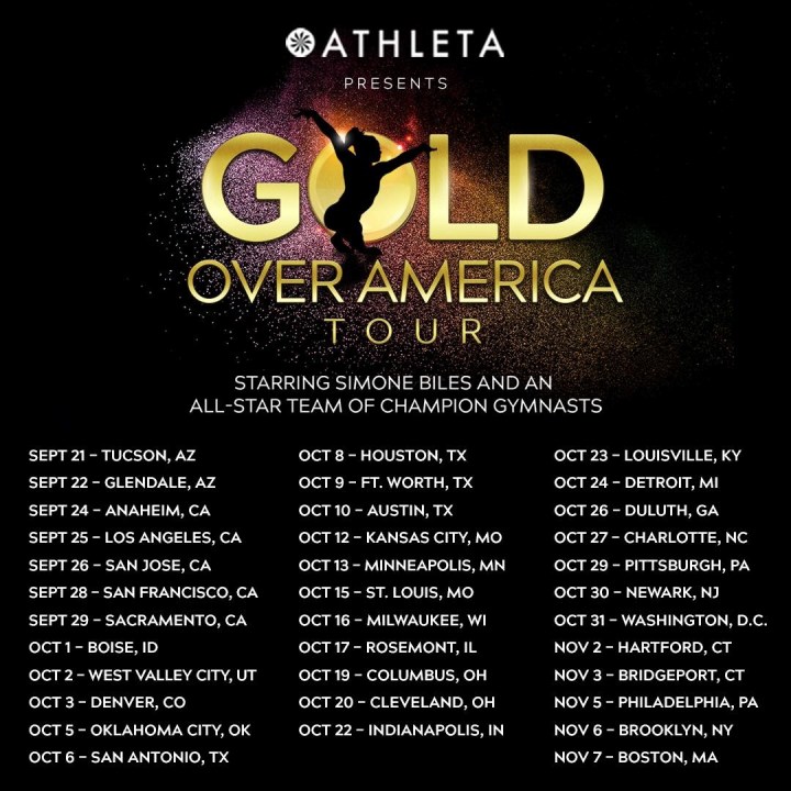 “I love the sport of gymnastics and want to help create a show that captures the pure joy of performing,” said Biles. “Athleta Presents Gold Over America Tour will match athleticism and entertainment, all while celebrating the gold inside each of us!”