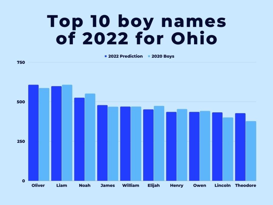 Liam was the number one name for boys in 2020 across the U.S. and in Ohio. However, Names.org predicts Oliver will outpace Liam to take the state’s top spot for 2022. The site anticipates that 607 new Buckeye State babies will be named Oliver in 2022. Liam will drop to second place with 598 babies expected to receive the name.