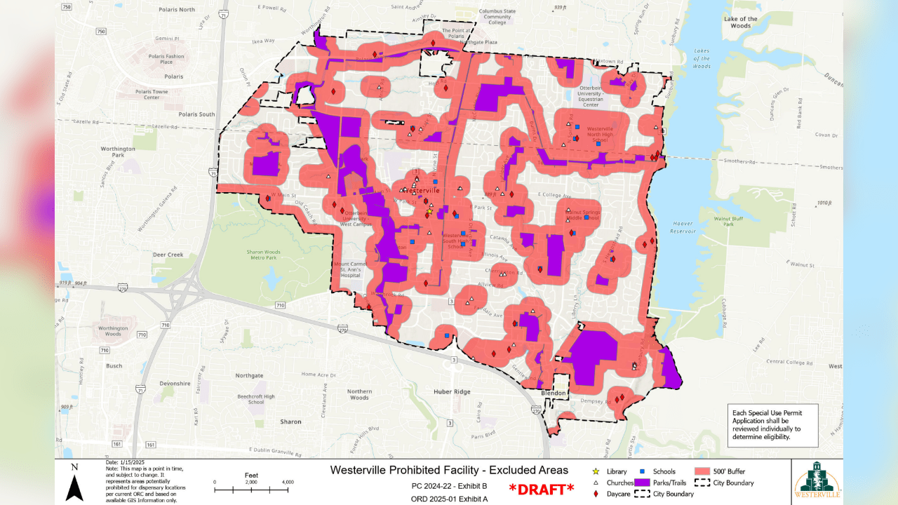 Westerville City Council unanimously approved the measure on Feb. 4, mirroring Ohio Revised Code that says retail dispensaries cannot be located within 500 feet of a school, church, library, playground or park. The ordinance also bans a dispensary from being situated within one mile of another dispensary.