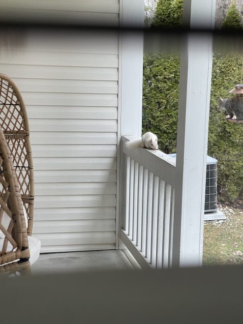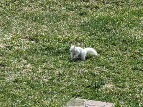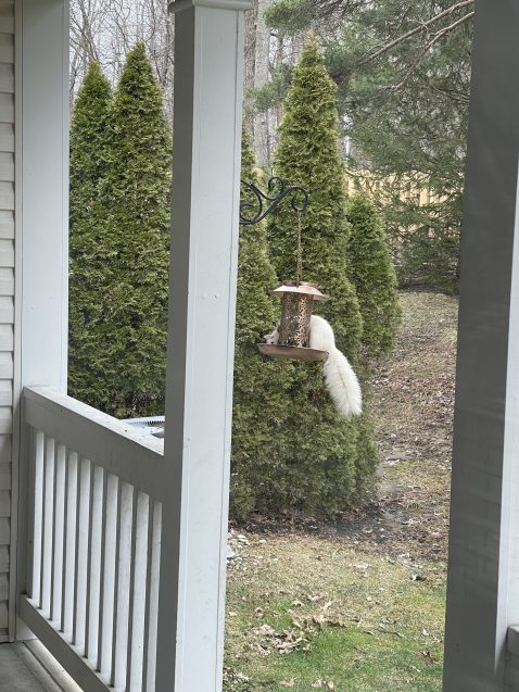 “We always get a lot of entertainment from our white squirrels — whether they are climbing trees, chasing grey squirrels, trying to get in the bird feeders, or eating the peanuts my mom sometimes puts out for them,” Langlois said. “They are pretty fun to watch!”