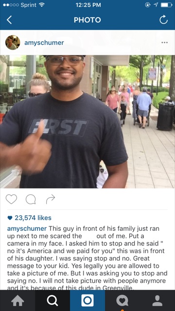 Schumer held a comedy show in Greenville Friday night. She was downtown Greenville Saturday and made the Instagram post the same day. She claims a man scared her and insisted on taking photos even after she asked him not to. The post says the man said “no it’s America and we paid for you.” She added that he was the reason she wouldn’t be taking photos with fans any longer.