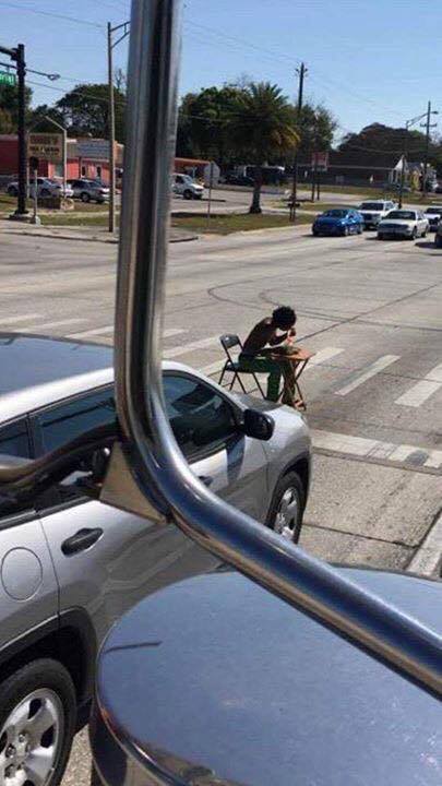 “There is a gentleman sitting in the middle of the road with a folding table, eating,” said one caller.