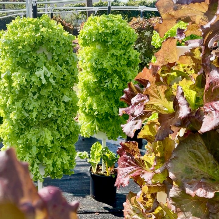 The irrigation system contains fertilizer and drips from the top and trickles down through the tower. At the base of each tower, rooted veggies like beets, radishes, and carrots are growing. The whole plan is to maximize the potential harvest and extend the growing season starting in early spring and ending in late fall.