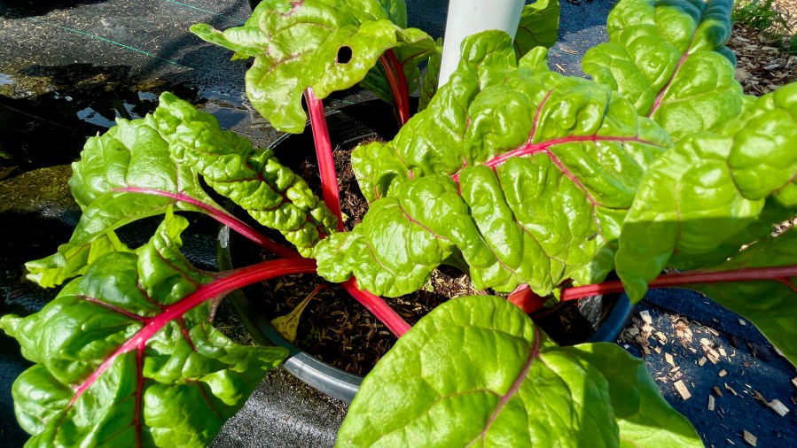 The irrigation system contains fertilizer and drips from the top and trickles down through the tower. At the base of each tower, rooted veggies like beets, radishes, and carrots are growing. The whole plan is to maximize the potential harvest and extend the growing season starting in early spring and ending in late fall.