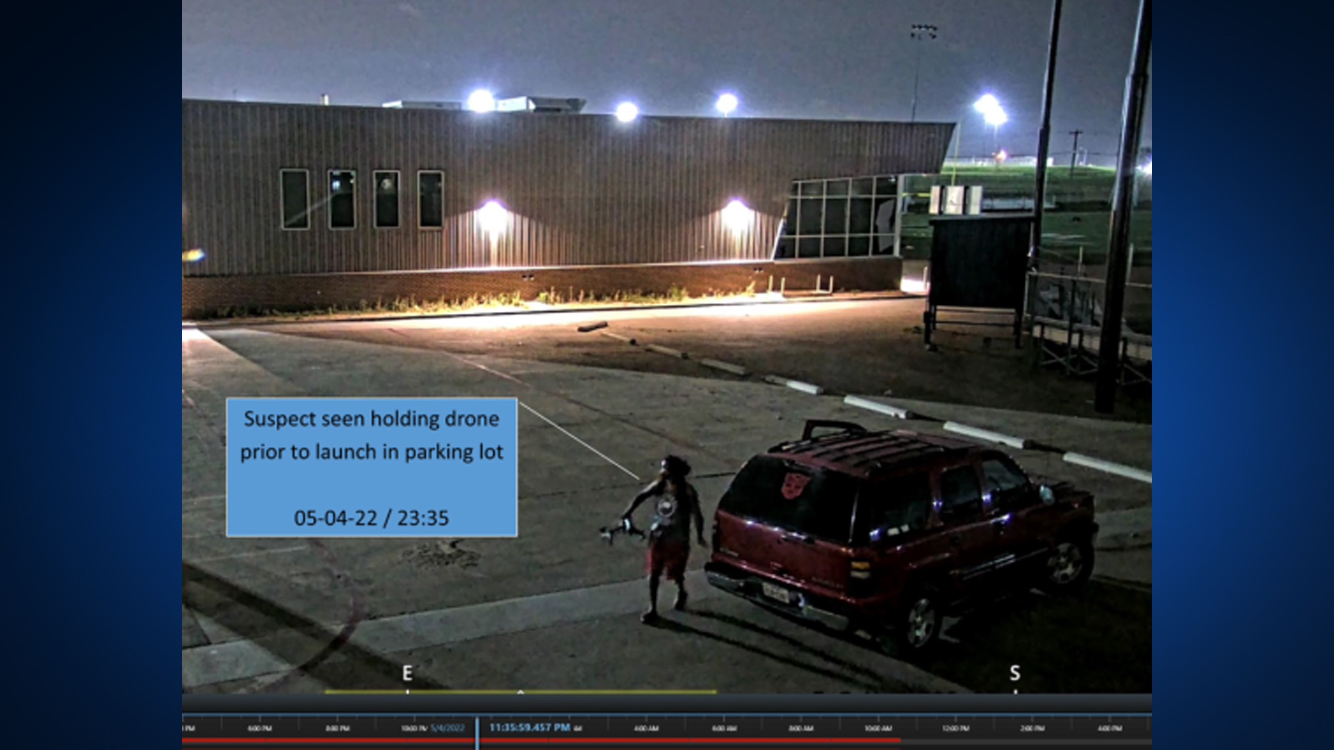 Nearby surveillance pulled by law enforcement showed a man drive up, remove a drone and a package from the vehicle, launch the drone towards the prison and then drive off.