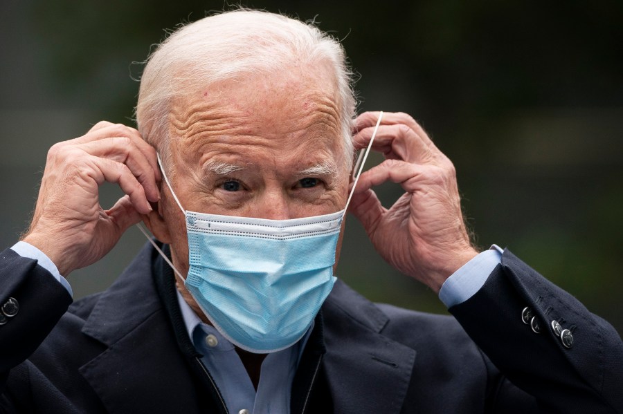 Joe Biden puts on a face mask while speaking to reporters at a voter mobilization center on October 26 in Chester, Pennsylvania. In Pennsylvania, (Photo by Drew Angerer/Getty Images)