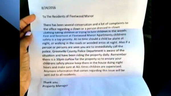 GREENVILLE, SC (CNN)–Clown sightings in a South Carolina neighborhood have been the talk of Fleetwood Manor Apartments, and it has most parents on high alert.