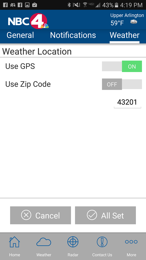 Under the settings section, you’ll click the weather tab. You will then be able to choose to have the weather tailored to the GPS location of your phone or by Zip Code.