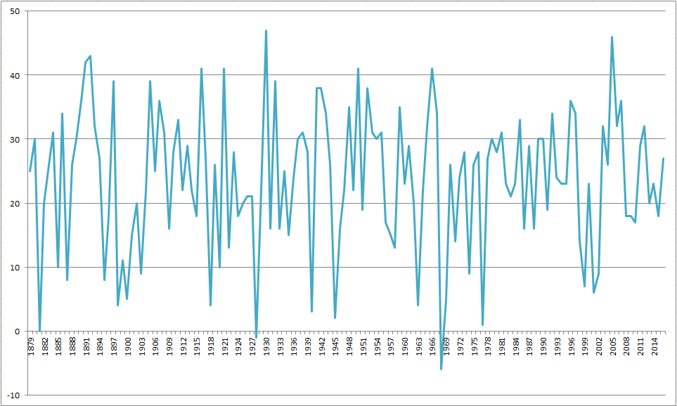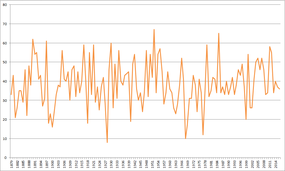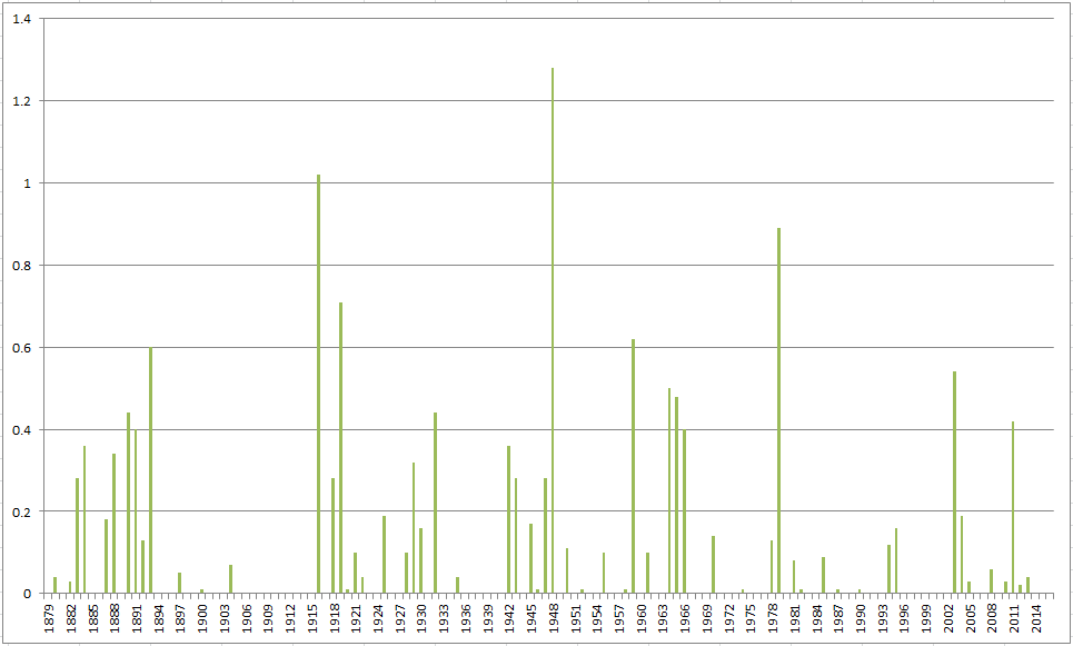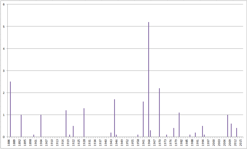 Below is the 138 year history of precip. for January 1st: