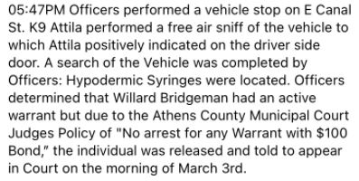 But the situation is causing concern for Nelsonville police. For instance, in a social media post on March 2: “Officers determined that Willard Bridgeman had an active warrant but due to the Athens County Municipal Court Judge’s Policy of ‘No arrest for any Warrant with $100 Bond’ the individual was released…”