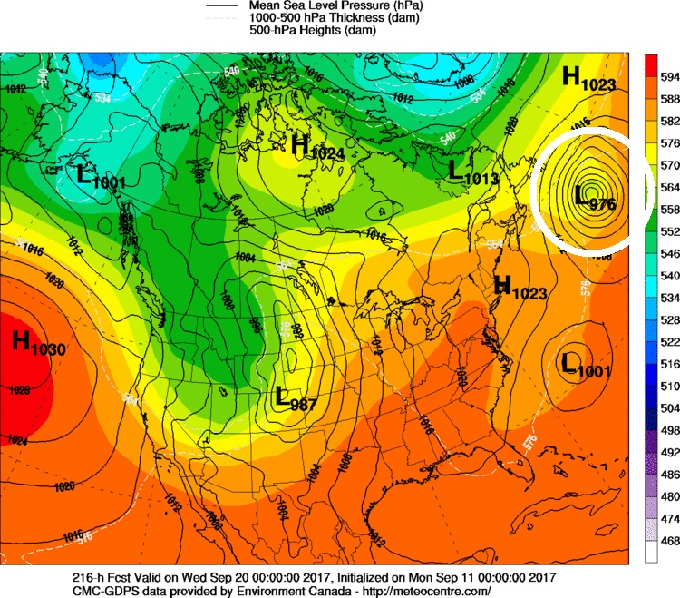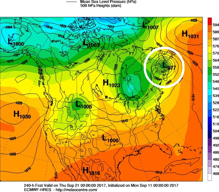Below is the European forecast model and notice this has a landfall with Jose somewhere near Nova Scotia & Newfoundland in Canada.  This would be around the same time late next Wednesday night.