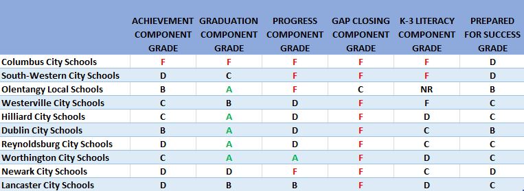 Columbus City Schools got a failing grade in five of the six categories, including F’s in Achievement, Gap Closing, K-3 Literacy, Progress and Graduation Rate. Only 73.7% of students graduated in four years. More information about the components can be found here.