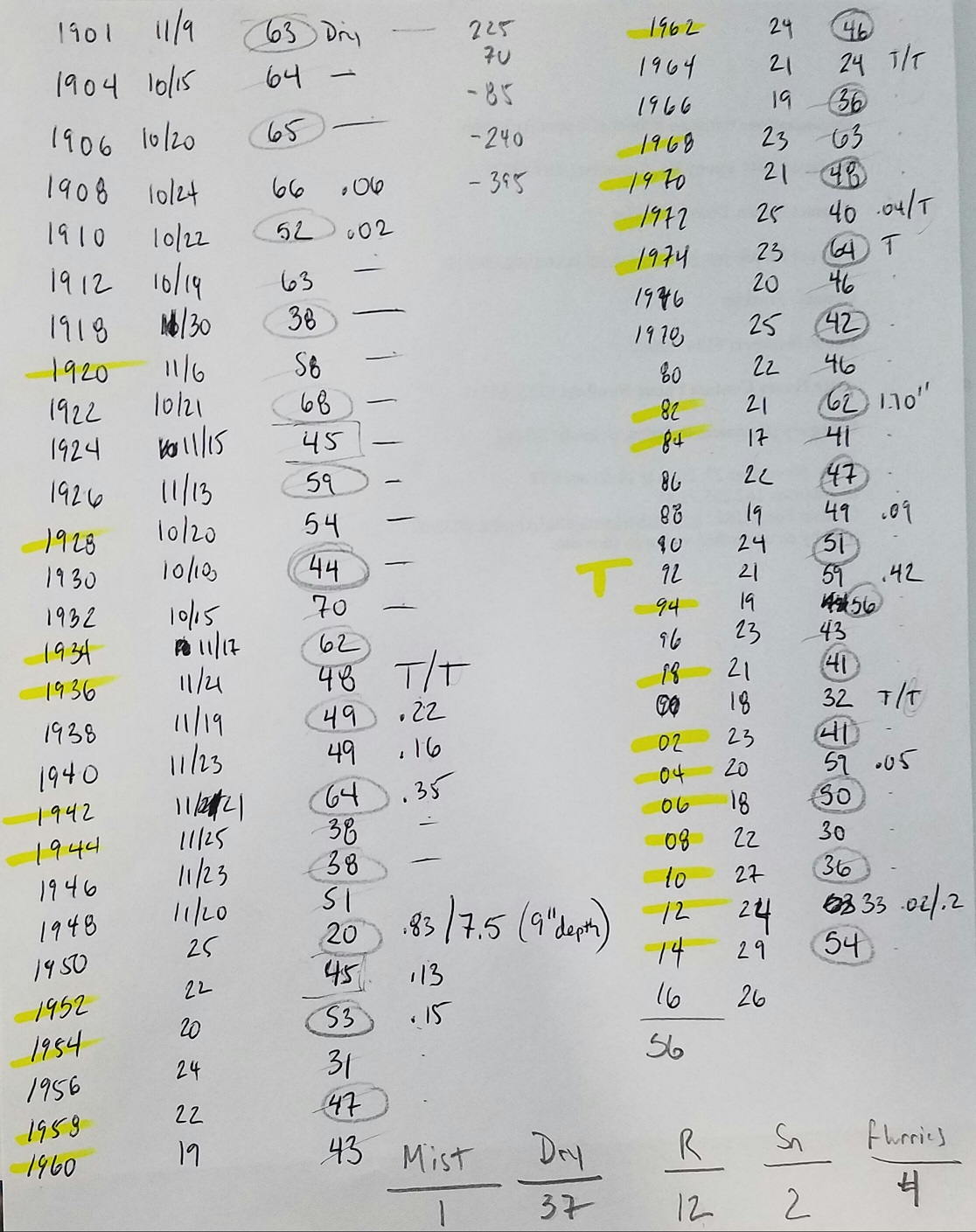 It is interesting to note that Ohio State has beat that team up north at home when temperatures have been in the 30s, 40s, 50s, and 60s, but never when temperatures have been in the 70s or 20s!Precipitation has fallen in many forms since 1901 here in Columbus, including the incredible “Snow Bowl” in 1950:
