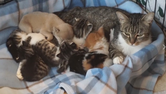 MHS found a human foster family to pair the puppy with a cat, named Gwen, who was nursing several kittens. The bonding between species was a success.