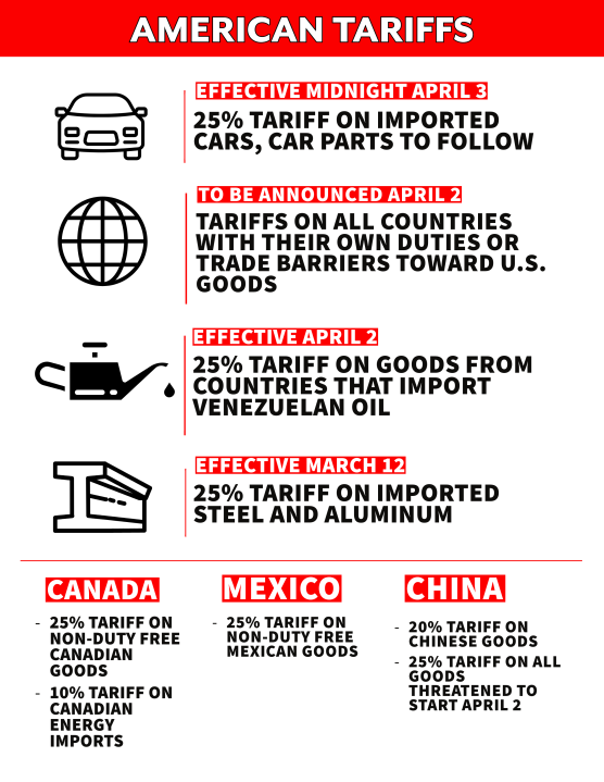 Trump has announced, threatened or rolled back various tariffs, but the infographic displays those currently confirmed. Those enacted on Mexico and Canada do not include goods protected under trade agreements, but this week’s tariffs could change that.