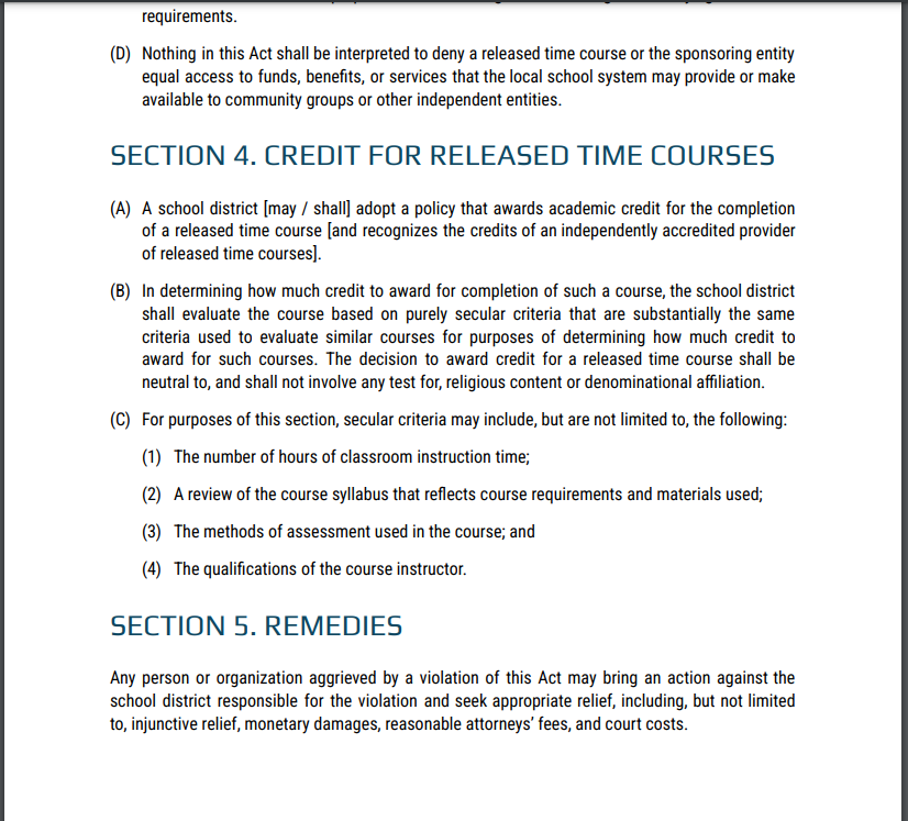 At the December meeting, a LifeWise representative presented about the importance of release time for religious instruction and how states should ensure their laws about release time say districts “shall” implement release policies, rather than districts “may.” At the end of his presentation, he provided a sample bill for legislators to implement.