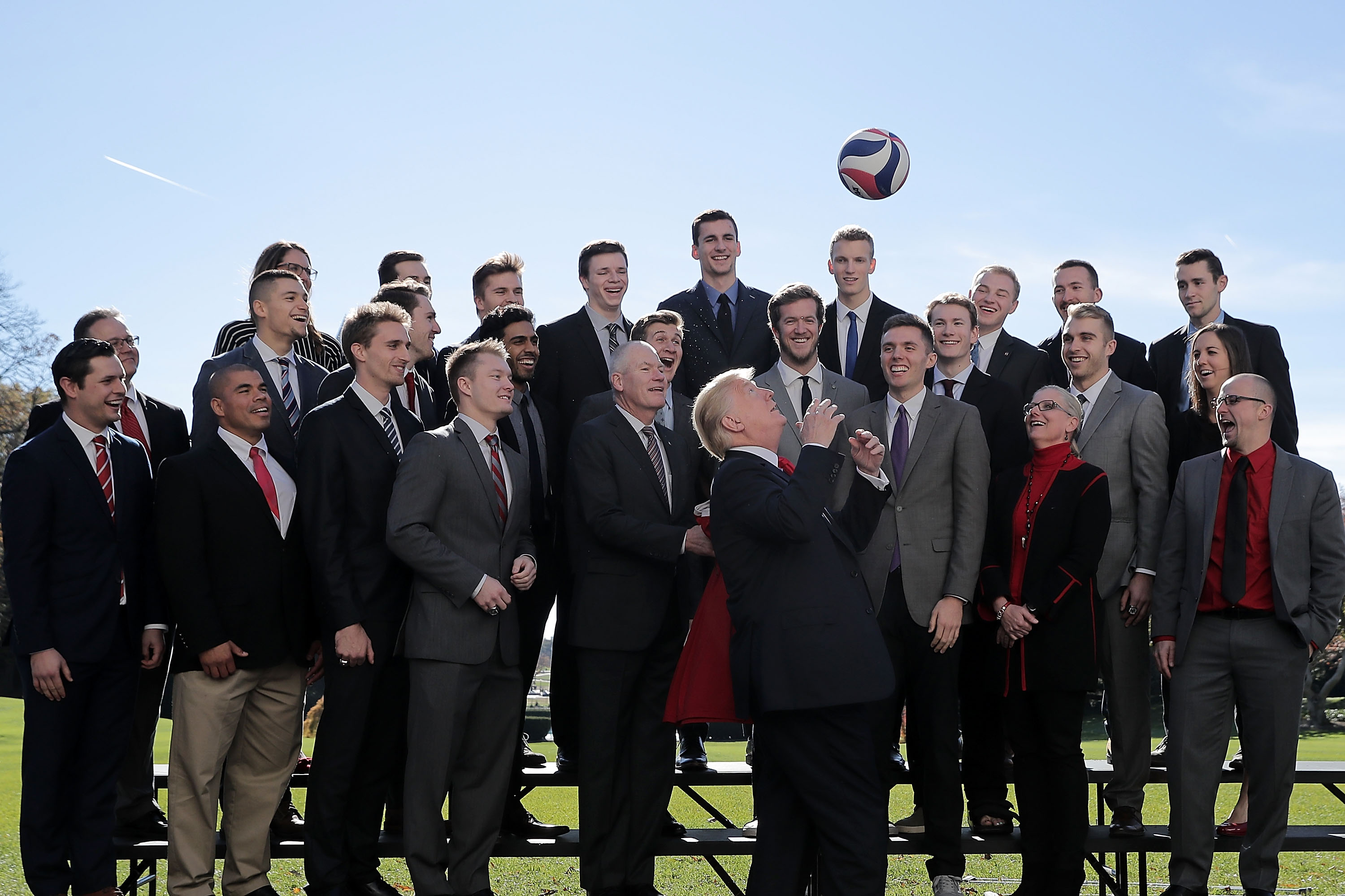 Trump posed for photos with the players throughout the Rose Garden, South Lawn and inside the White House and then sent them off to the Oval Office for a quick tour. At one point, the president playfully got into a wrestling pose with members of the Penn State men’s team. Chatting with the Ohio State men’s volleyball team, he popped a colorful volleyball into the air.