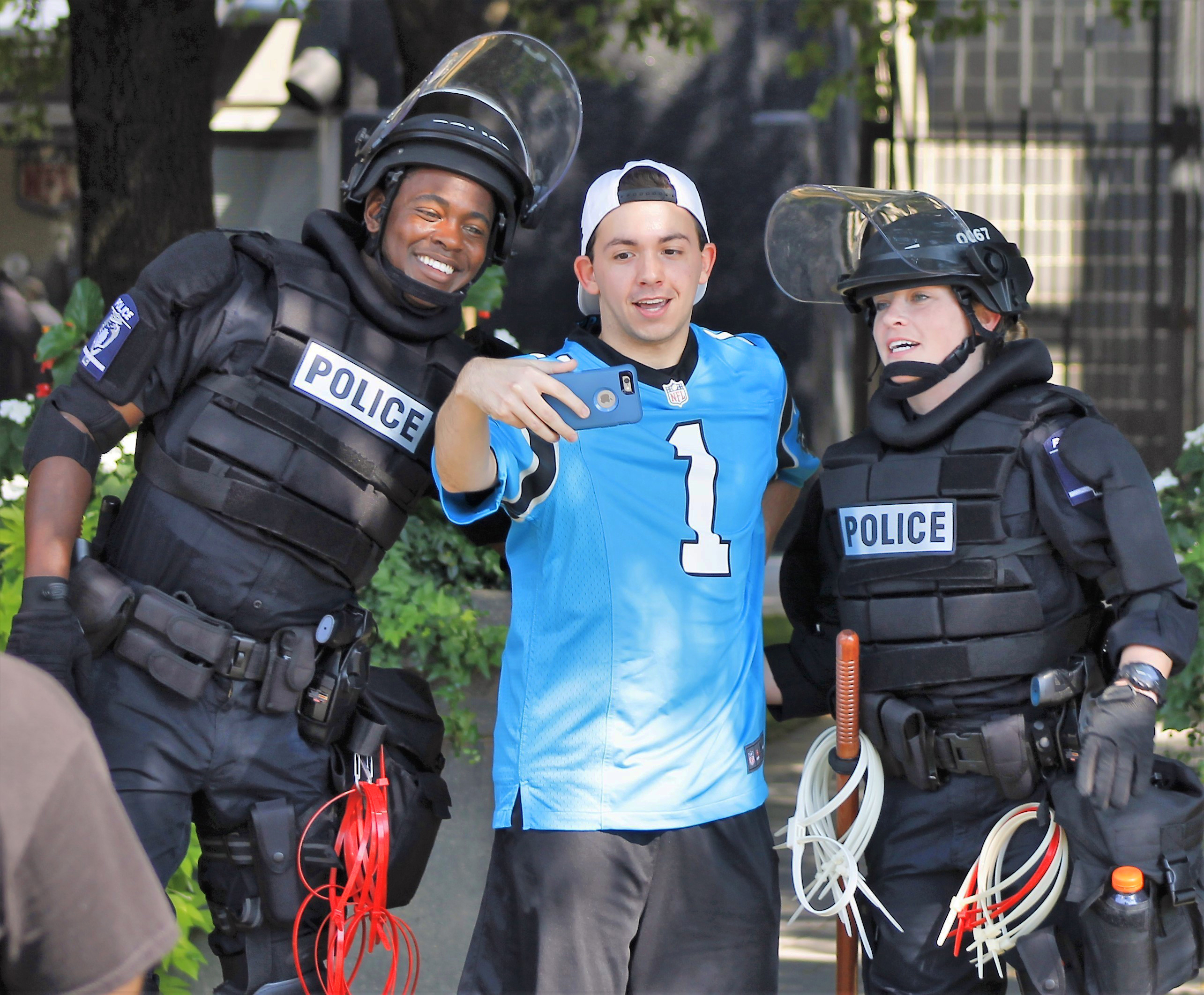 Instead, it was quiet in the hours leading up to the game, as many fans stopped to hug officers and pose for pictures. Protesters didn’t gather until about an hour before kickoff, when the group used bullhorns and held signs in demonstration.MORE: Police release body camera, dashboard videos of Keith Scott shooting