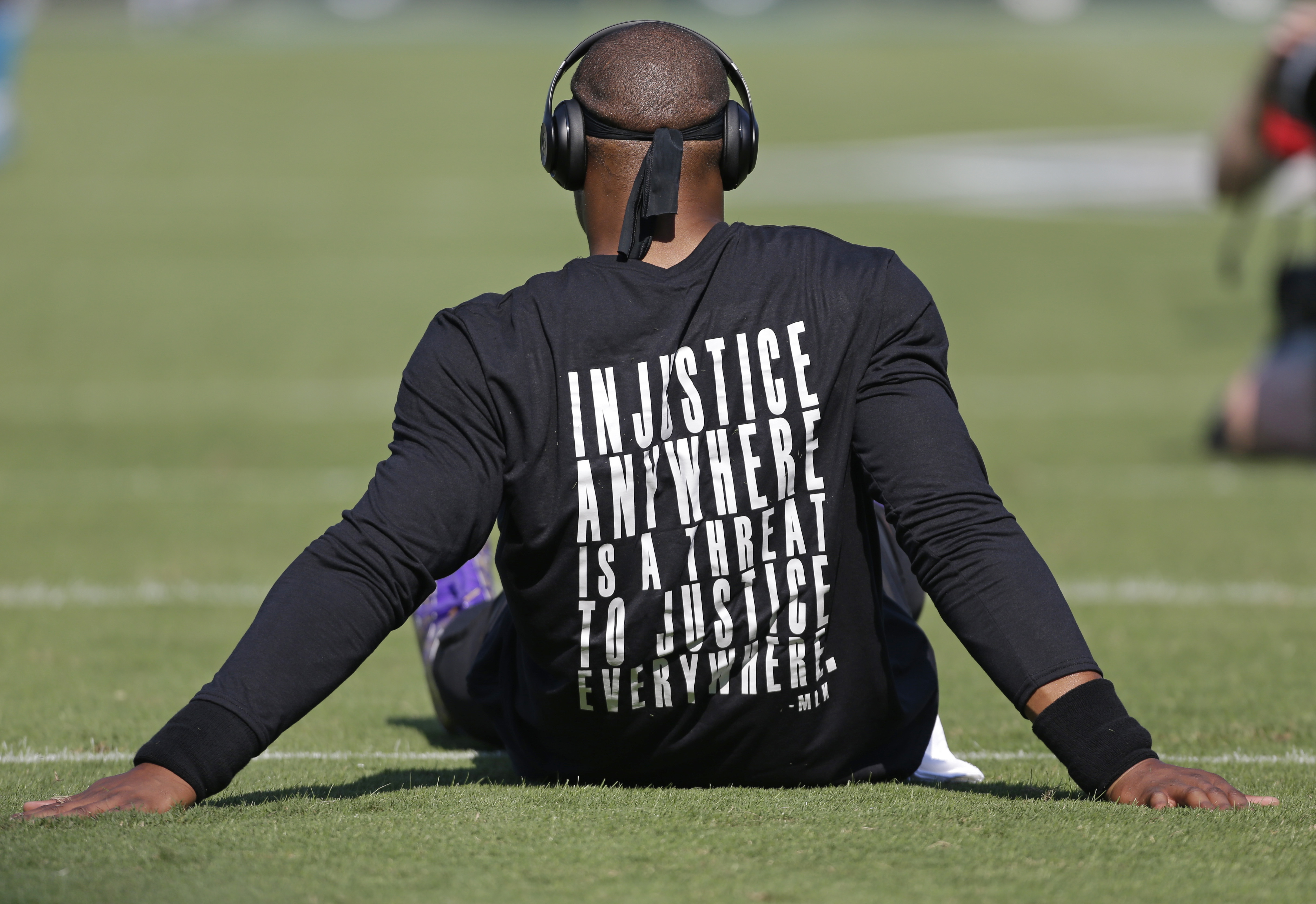 Meanwhile, Panthers quarterback Cam Newton wore a T-shirt emblazoned with a quote by Martin Luther King Jr. on the back as he warmed up for the game. The dark shirt read “Injustice Anywhere Is A Threat to Justice Everywhere.”