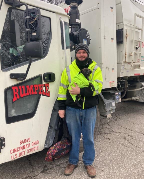 CINCINNATI, Ohio (WCMH) — A puppy thrown to the roadside in a backpack was rescued by a garbage truck driver who gave her a forever home.