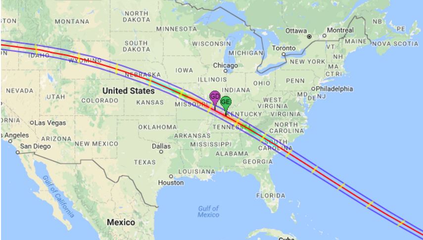 According to NASA, the path of the Moon’s umbral shadow begins in northern Pacific and crosses the USA from west to east through parts of the following states: Oregon, Idaho, Montana, Wyoming, Nebraska, Kansas, Iowa, Missouri, Illinois, Kentucky, Tennessee, North Carolina, Georgia, and South Carolina (note: only a tiny corner of Montana and Iowa are in the eclipse path). The Moon’s penumbral shadow produces a partial eclipse visible from a much larger region covering most of North America.