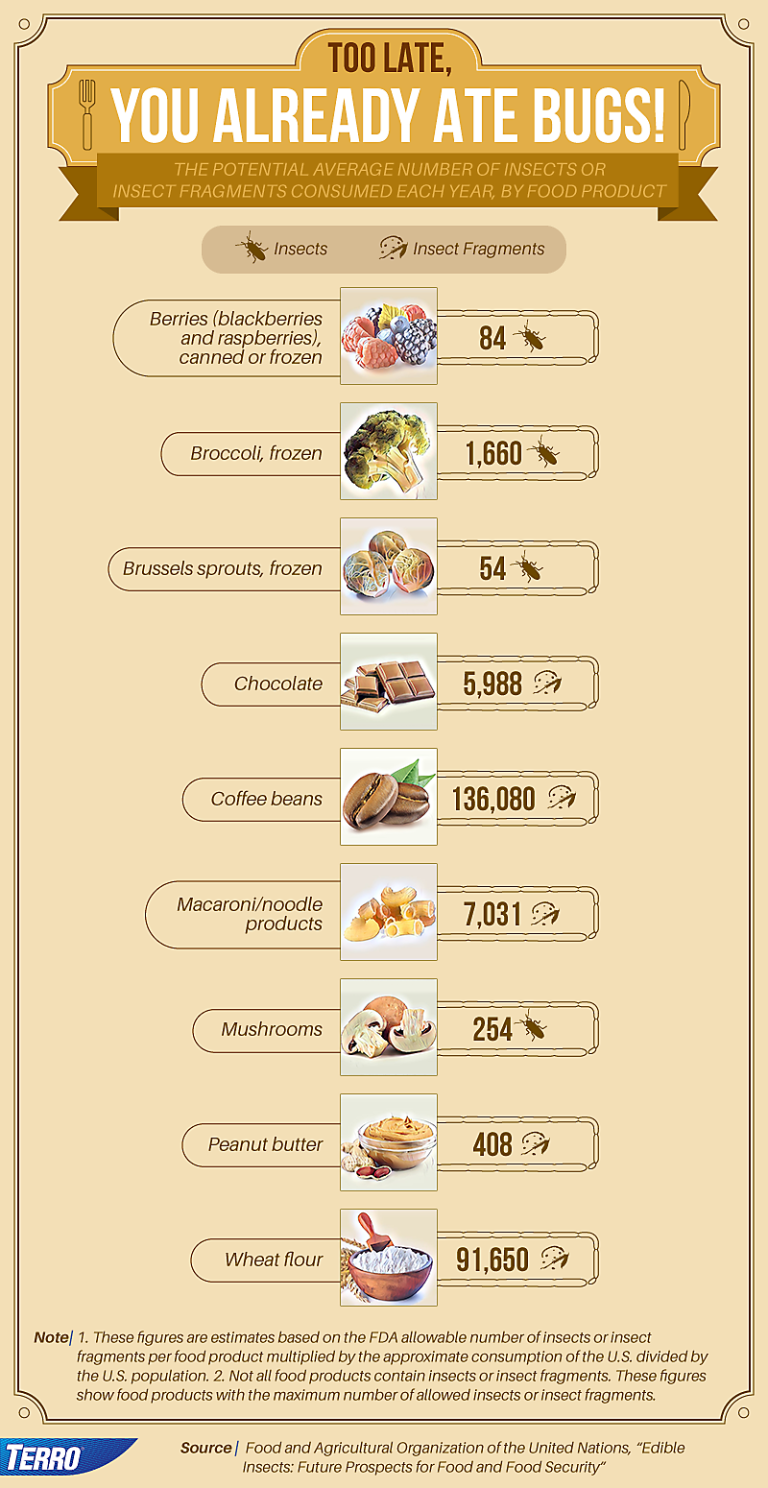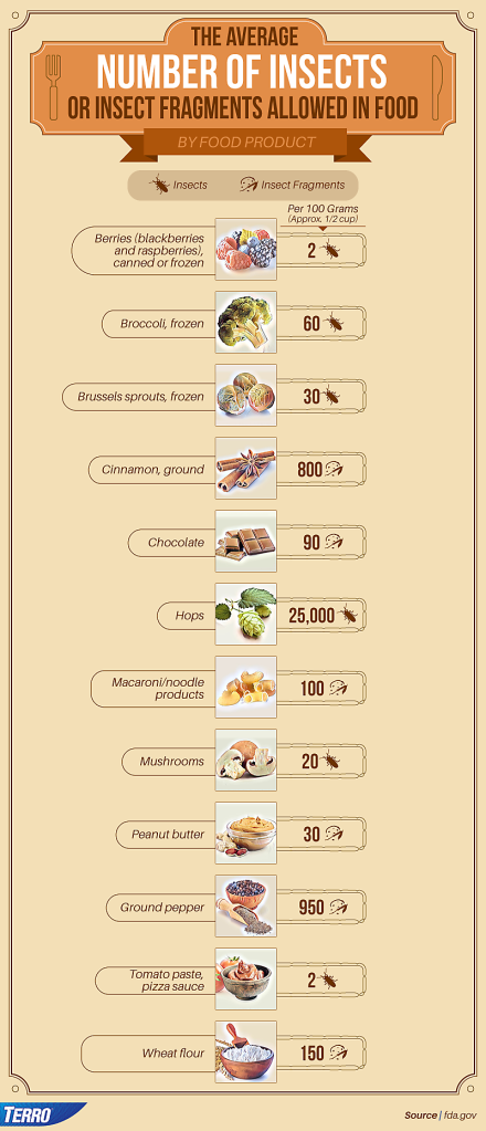 Terro based their report off the FDA Action Levels Handbook and an article published by the Food and Agriculture Organization of the United Nations called, “Edible Insects: Future prospects for food and feed security.”