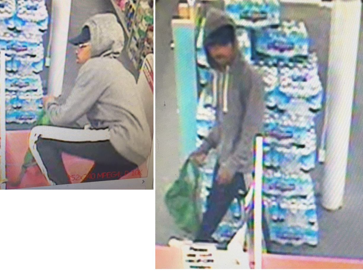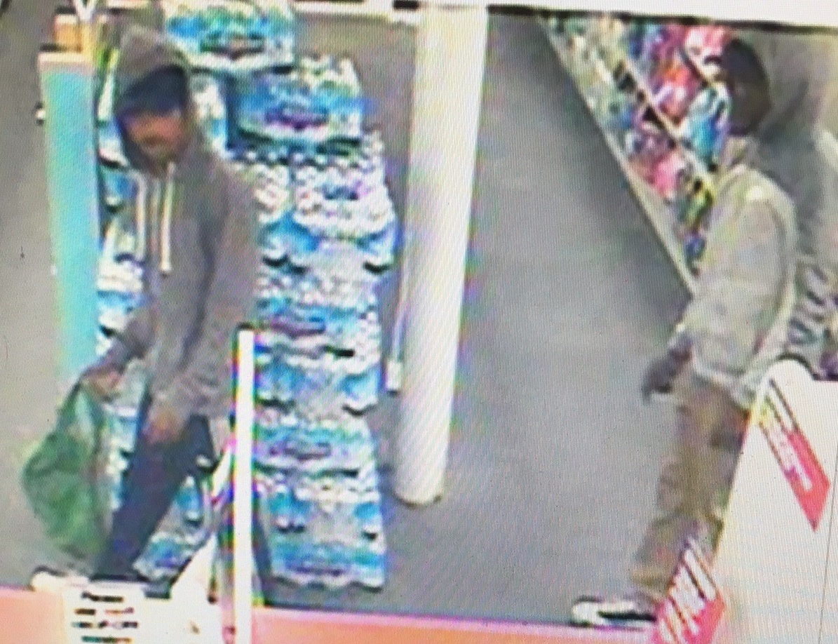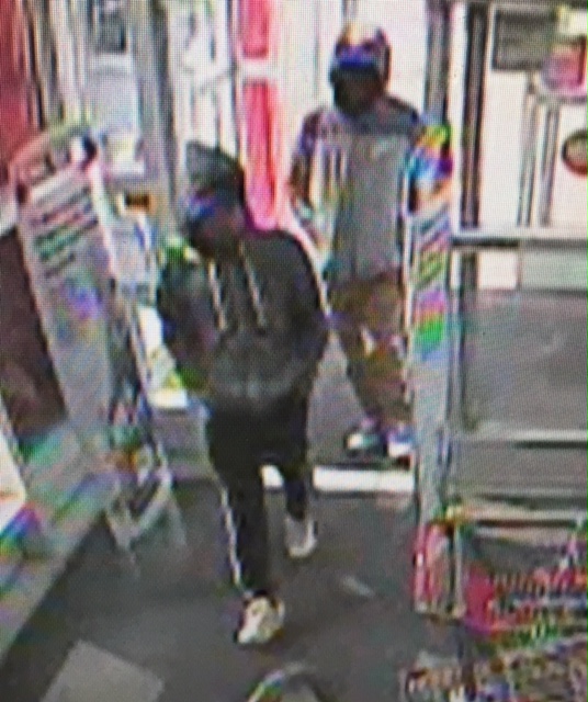 Both suspects are described as black men in their early-to-mid 20s with a medium complexion, about 5 feet 7 inches tall and between 120 and 160 pounds with thin to medium build. The man who hopped the counter wore wire-framed glasses, a gray hoodie, a dark baseball cap, dark sweatpants with white stripes down the side and white athletic shoes. The second man wore a dark baseball cap, a gray and white hoodie, tan pants and black and white tennis shoes.