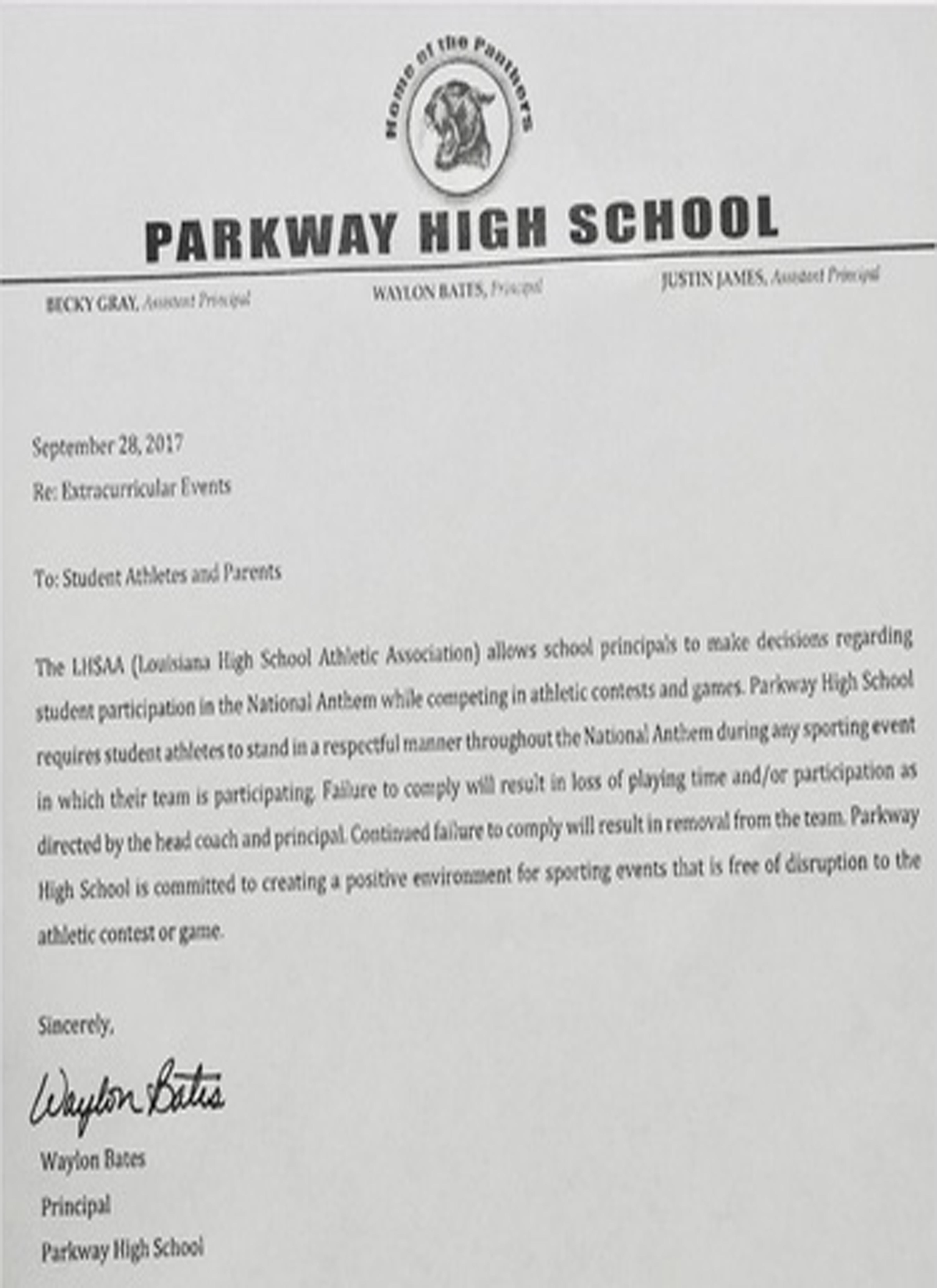 BOSSIER CITY, LA (KSHV) – Parkway High School released a letter to students and parents today stating that student-athletes who do not stand for the national anthem will face “loss of playing time and/or participation.”