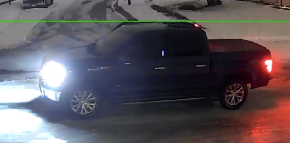 Police are looking for a dark, possibly blue or black, Ford F-150 Supercrew pickup truck, possibly a model released from 2015 through 2018, four doors, chrome door handles, short bed with a black bed cover. Rims are distinct – chrome alloy stock rims 10003, chrome door handles, chrome grille. Lateral bars are visible, but not clear; side mirrors may be black since the reflection is not as obvious on camera. Sometimes the taillights are off, other times on, but there are no license plates visible on either the front or back of the truck.