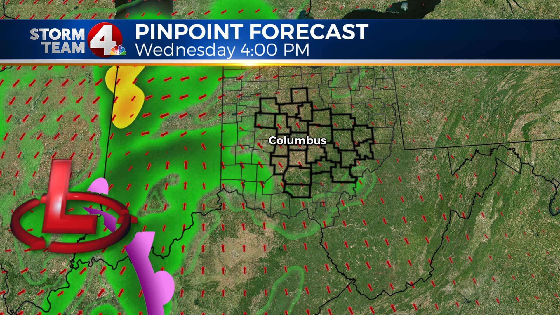 You can see our best chances of rain and t-storms comes in later Wednesday into the evening hours. In fact, (in the image below) you can see scattered storms, 2 lines converging in Central Ohio with those streaks of storms wrapping into the low (which I have hidden from the images).