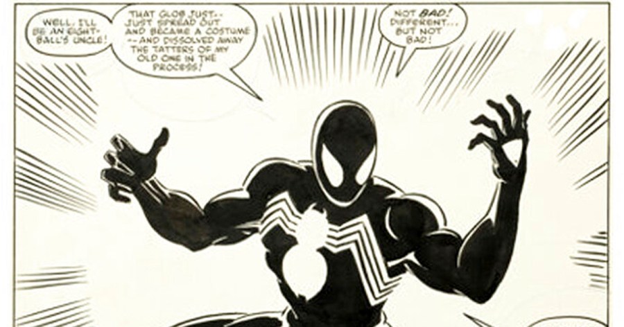 Mike Zeck’s artwork for page 25 from Marvel Comics’ “Secret Wars No. 8” brings the first appearance of Spidey’s black suit. The symbiote suit would eventually lead to the emergence of the character Venom.