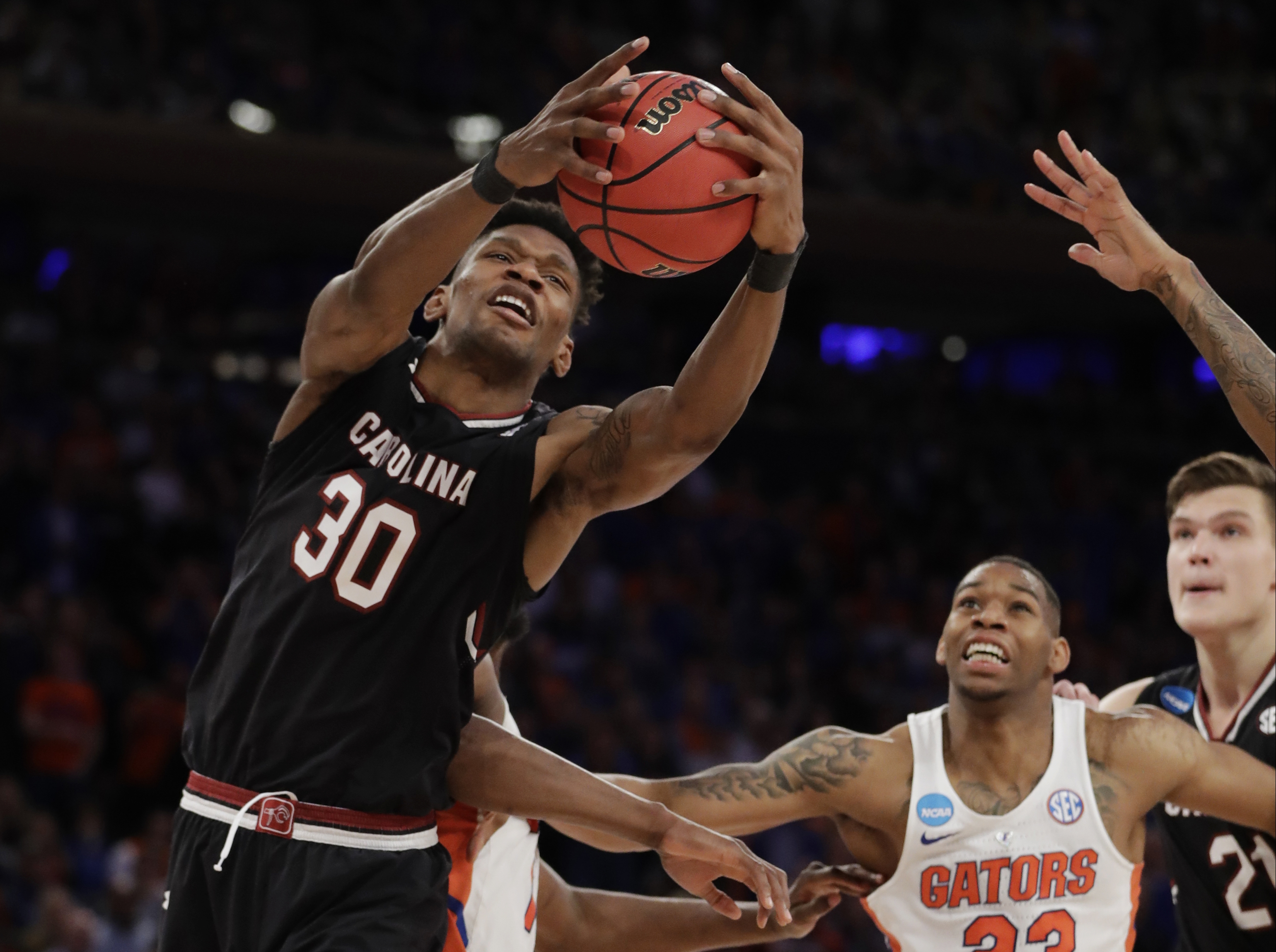The seventh-seeded Gamecocks (26-10) used their trademark swarming defense and some solid free throw shooting to beat their fellow Southeastern Conference Gators (27-9) in the East Regional final at Madison Square Garden.