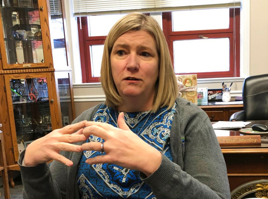 FILE—In this file photo from Dec. 19, 2019, Dayton mayor Nan Whaley gives an interview in her office in Dayton, Ohio. Whaley says she won't seek a third term, raising expectations the Democrat will seek higher office just days after she criticized Republican Gov. Mike DeWine. (AP Photo/Daniel Sewell, File)