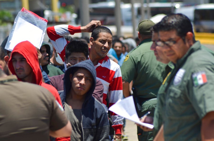 United States Border Patrol officers return a group of migrants back to the Mexico side of the border as Mexican immigration officials check the list, in Nuevo Laredo, Mexico, Thursday, July 25, 2019. Mexico has received some 20,000 asylum seekers returned to await U.S. immigration court dates under the program colloquially known as "remain in Mexico." (AP Photo/Salvador Gonzalez)