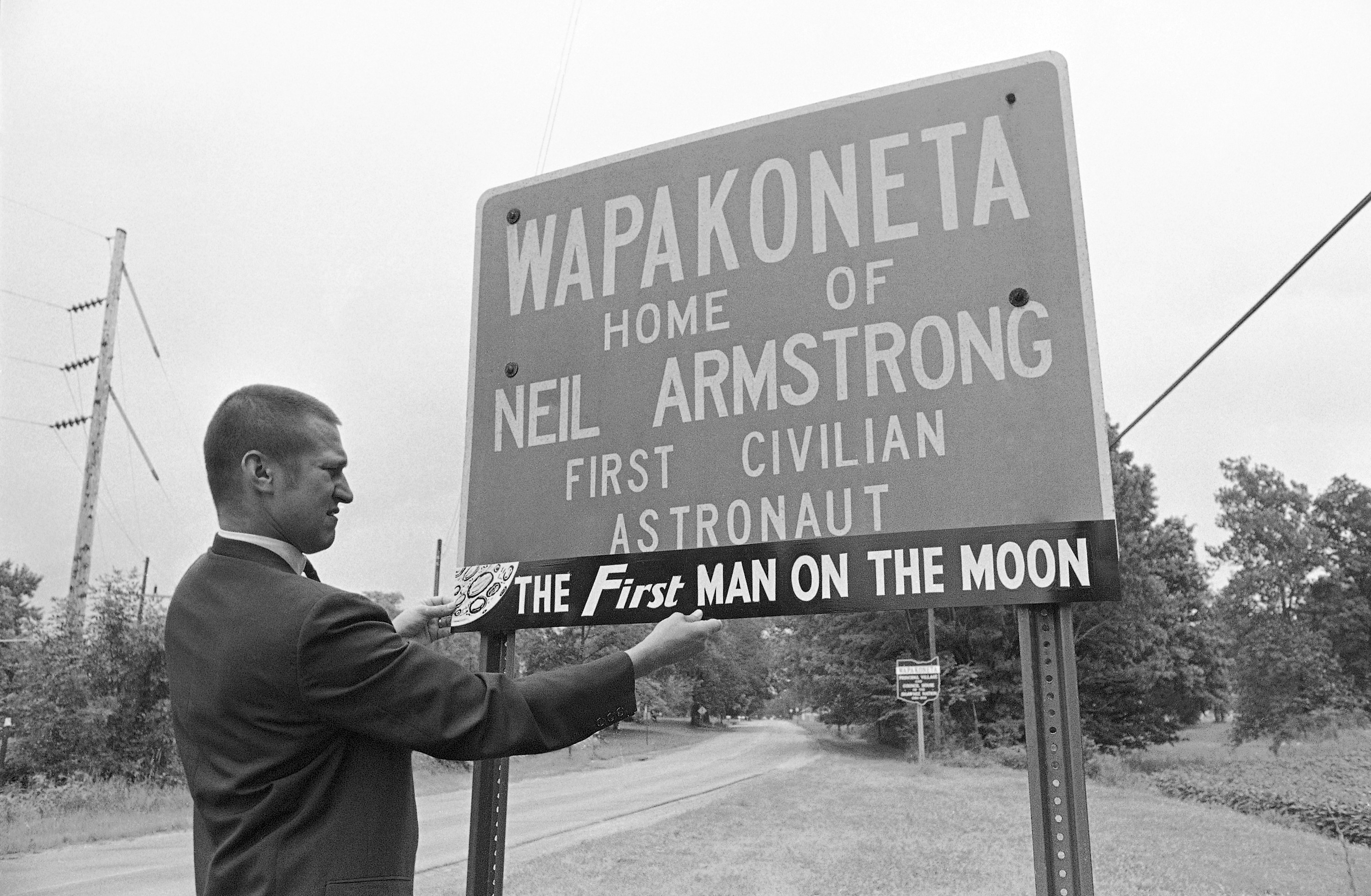 FILE – In this July 21, 1969 file photo, Charles Brading, a druggist and personal friend of astronaut Neil Armstrong, checks the size and placing of a temporary sign addition proclaiming their local hero in Wapakoneta, Ohio. Neil Armstrong helped put Wapakoneta on the map July 20, 1969, when he became the first human to walk on the moon. The late astronaut remains larger than life in the city 60 miles (96.56 kilometers) north of Dayton, where visitors are greeted by the space base-shaped top of the space museum named for him as they exit Interstate 75. (AP Photo/GEH)