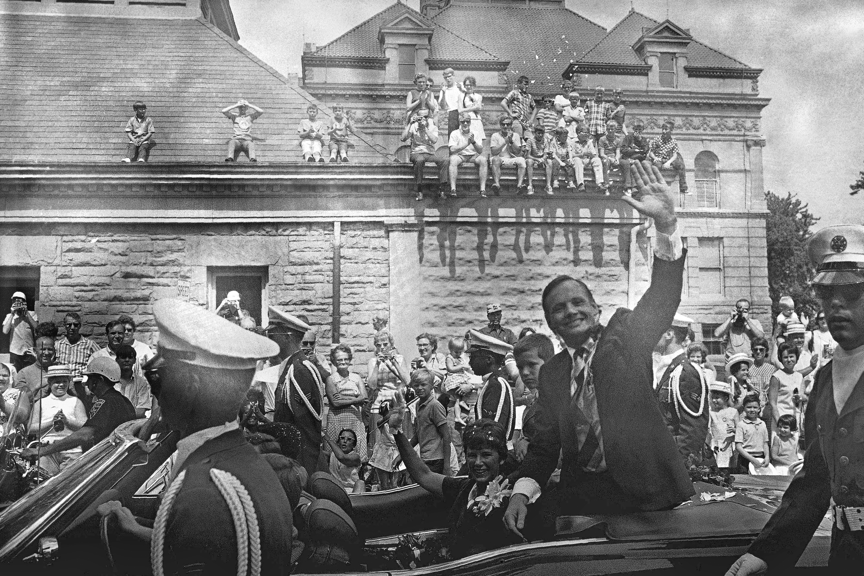 FILE – In this Sept. 6, 1969 file photo, people sit on the roof ledge of the Auglaize County Courthouse to cheer hometown hero Neil Armstrong waving to the crowd during a parade honoring him for his moon-walk feat. Also shown is his wife, Jan, and son, Eric, in the parade in Wapakoneta, Ohio. Neil Armstrong helped put Wapakoneta on the map July 20, 1969, when he became the first human to walk on the moon. The late astronaut remains larger than life in the city 60 miles (96.56 kilometers) north of Dayton, where visitors are greeted by the space base-shaped top of the space museum named for him as they exit Interstate 75. (AP Photo)