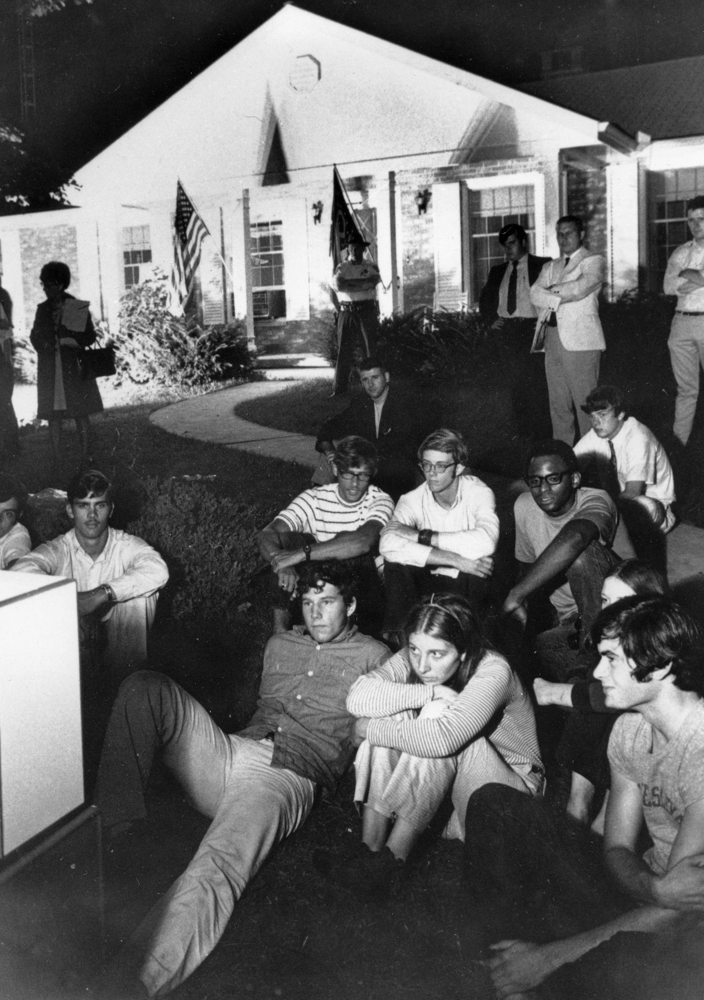 FILE – In this July 20, 1969 file photo, people sit on the lawn of the home of Stephen Armstrong in Wapakoneta, Ohio, to watch astronaut Neil Armstrong walk on the moon. Neil Armstrong helped put Wapakoneta on the map July 20, 1969, when he became the first human to walk on the moon. The late astronaut remains larger than life in the city 60 miles (96.56 kilometers) north of Dayton, where visitors are greeted by the space base-shaped top of the space museum named for him as they exit Interstate 75. (AP Photo/Bill Sauro)
