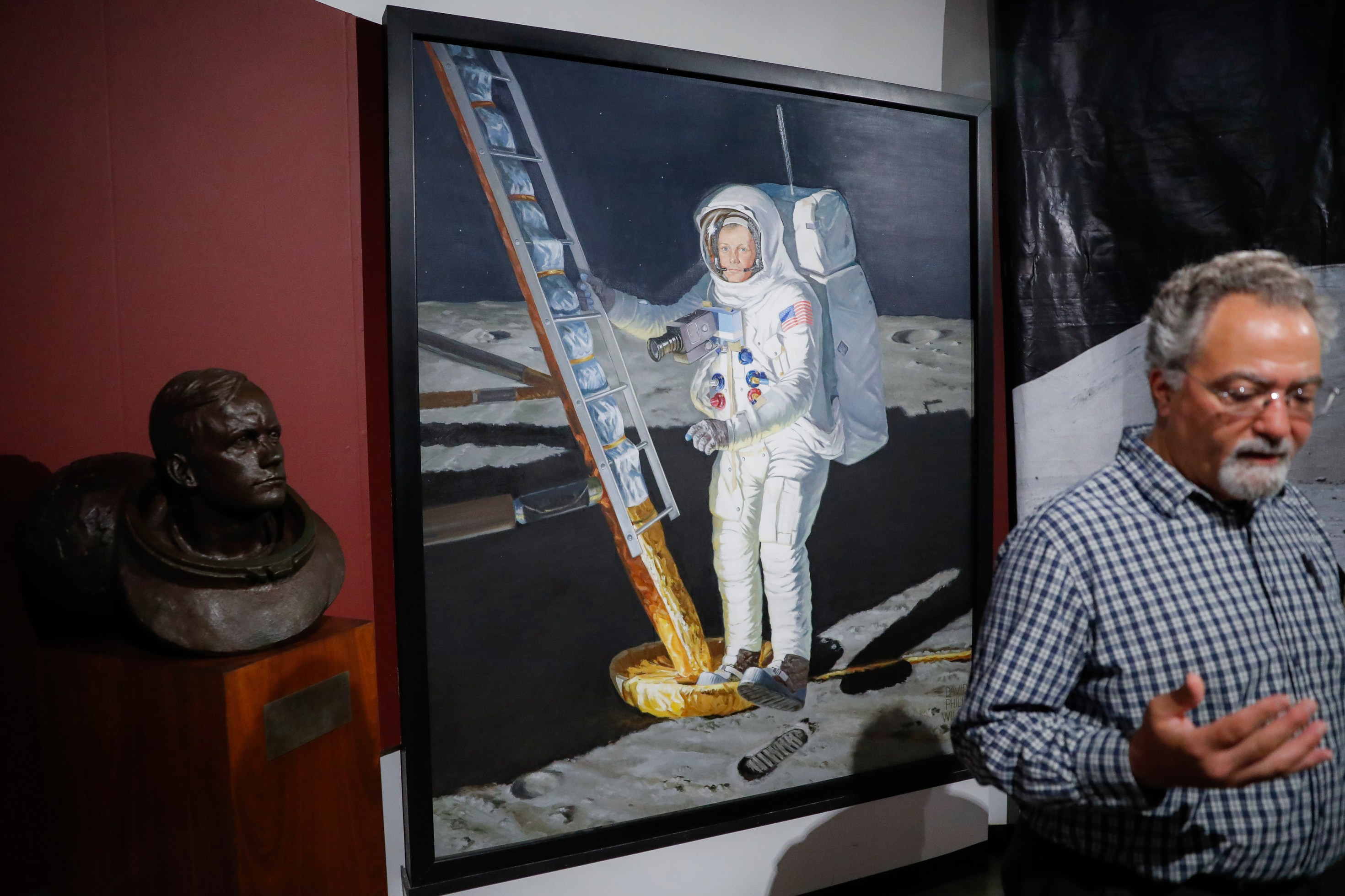 A portrait of astronaut Neil Armstrong stepping onto the surface of the moon is displayed behind museum director Dante Centuori, right, at the Armstrong Air & Space Museum, Wednesday, June 26, 2019, in Wapakoneta, Ohio. Neil Armstrong helped put Wapakoneta on the map July 20, 1969, when he became the first human to walk on the moon. The late astronaut remains larger than life in the city 60 miles (96.56 kilometers) north of Dayton, where visitors are greeted by the space base-shaped top of the space museum named for him as they exit Interstate 75. (AP Photo/John Minchillo)