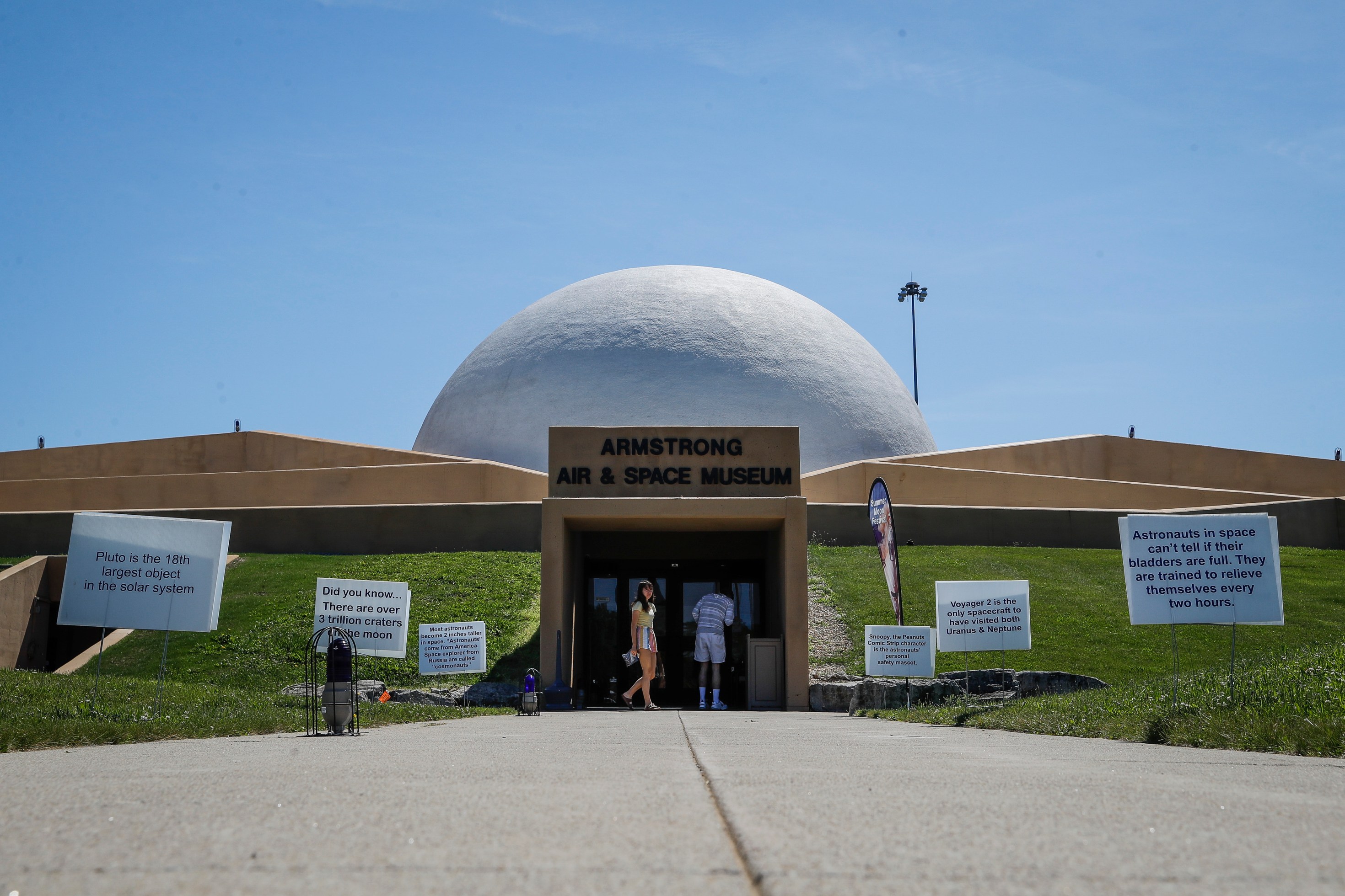 Visitors linger outside the Armstrong Air & Space Museum, Wednesday, June 26, 2019, in Wapakoneta, Ohio. Neil Armstrong helped put Wapakoneta on the map July 20, 1969, when he became the first human to walk on the moon. The late astronaut remains larger than life in the city 60 miles (96.56 kilometers) north of Dayton, where visitors are greeted by the space base-shaped top of the space museum named for him as they exit Interstate 75. (AP Photo/John Minchillo)