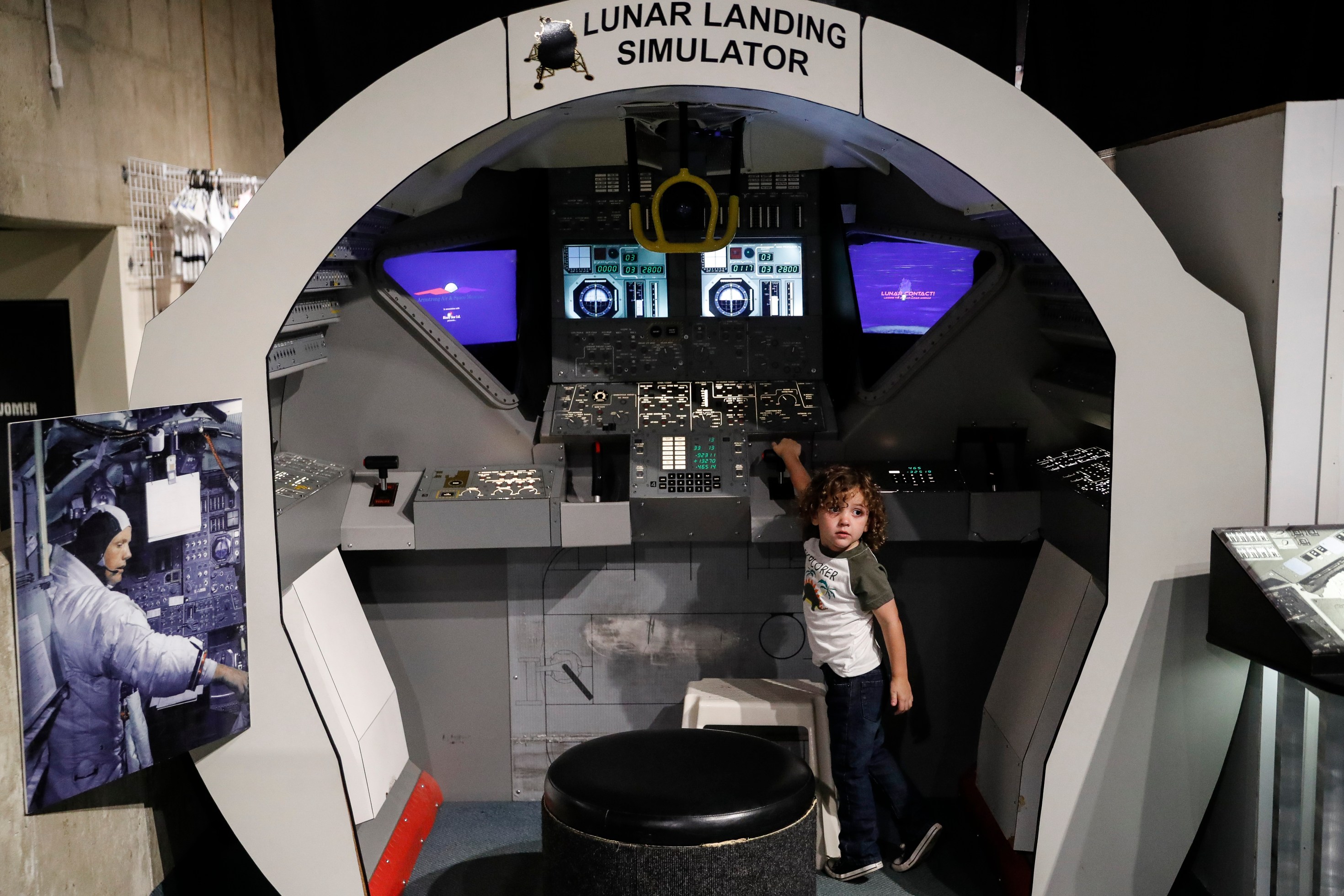 Henry Cook plays inside a Lunar Landing Simulator at the Armstrong Air & Space Museum, Wednesday, June 26, 2019, in Wapakoneta, Ohio. Very down to earth about most things, folks in this small western Ohio city are over the moon as they get ready to celebrate the 50th anniversary of the day they watched their hometown hero along with the world. Neil Armstrong put Wapakoneta on the map in July 1969 when he became the first human to walk on the moon. (AP Photo/John Minchillo)