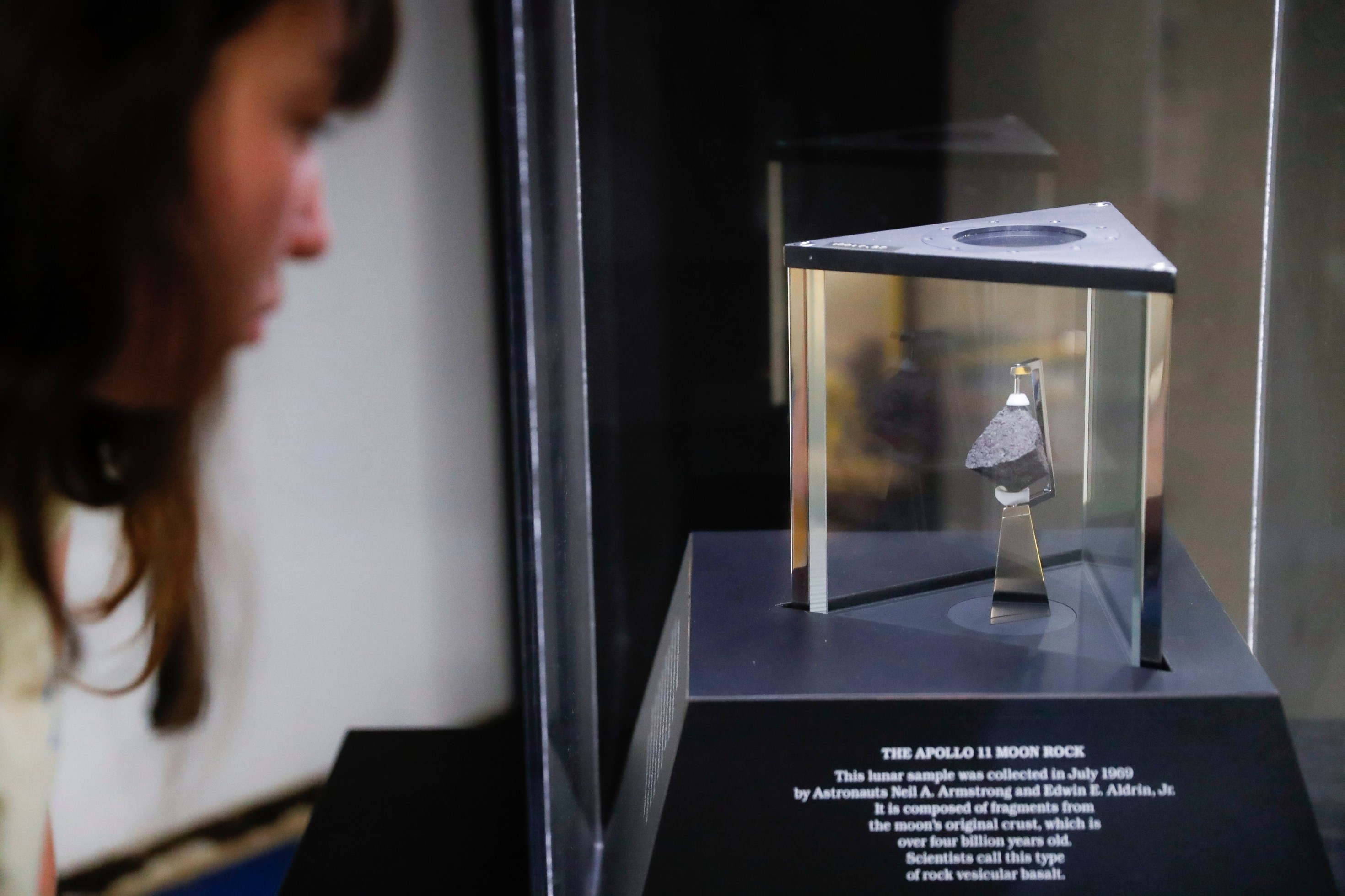 A moon rock is displayed within a glass case at the Armstrong Air & Space Museum, Wednesday, June 26, 2019, in Wapakoneta, Ohio. Neil Armstrong helped put Wapakoneta on the map July 20, 1969, when he became the first human to walk on the moon. The late astronaut remains larger than life in the city 60 miles (96.56 kilometers) north of Dayton, where visitors are greeted by the space base-shaped top of the space museum named for him as they exit Interstate 75. (AP Photo/John Minchillo)