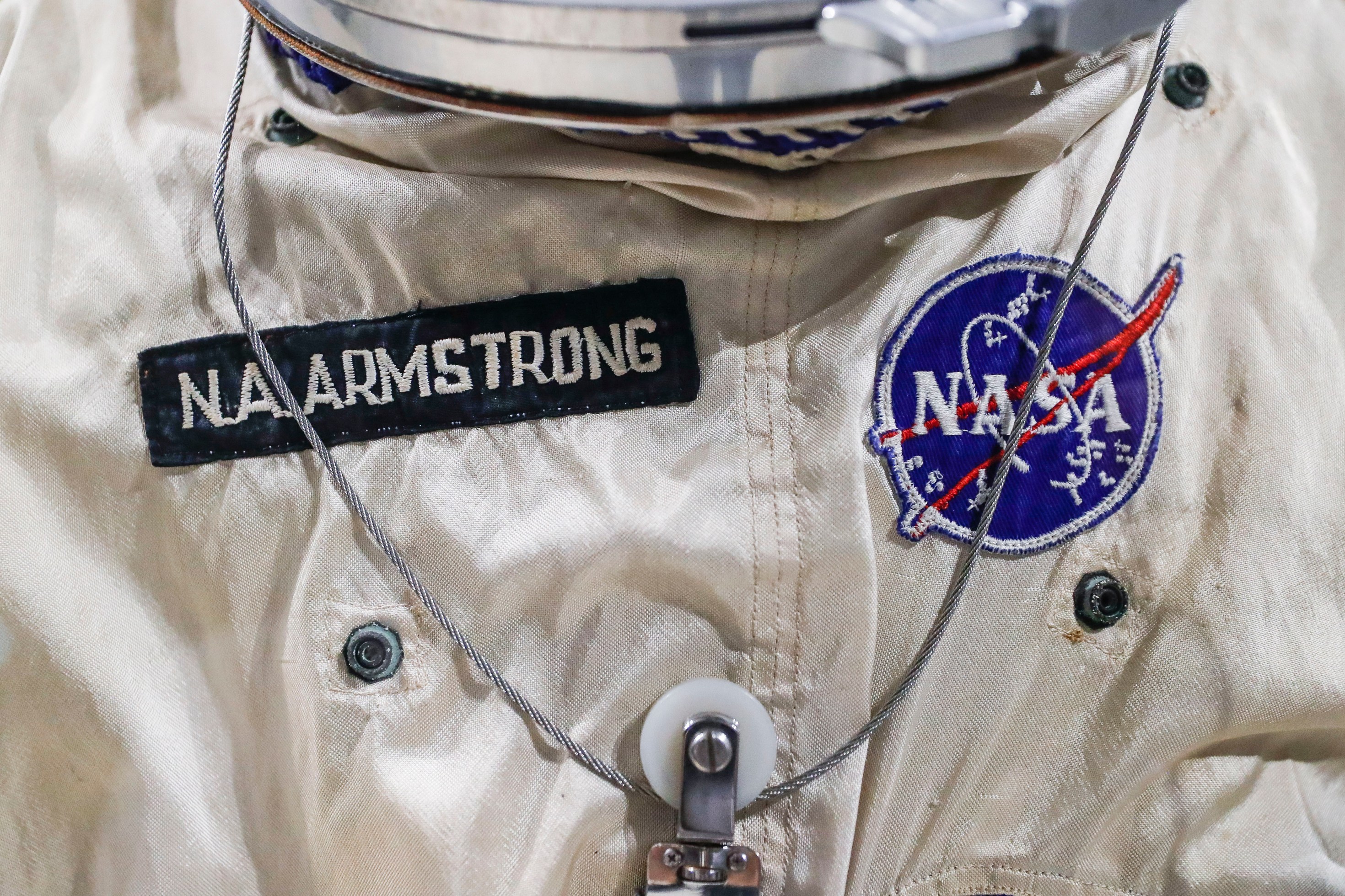 Patches adorn the spacesuit worm by astronaut Neil Armstrong for the Gemini VIII mission at the Armstrong Air & Space Museum, Wednesday, June 26, 2019, in Wapakoneta, Ohio. Neil Armstrong helped put Wapakoneta on the map July 20, 1969, when he became the first human to walk on the moon. The late astronaut remains larger than life in the city 60 miles (96.56 kilometers) north of Dayton, where visitors are greeted by the space base-shaped top of the space museum named for him as they exit Interstate 75. (AP Photo/John Minchillo)