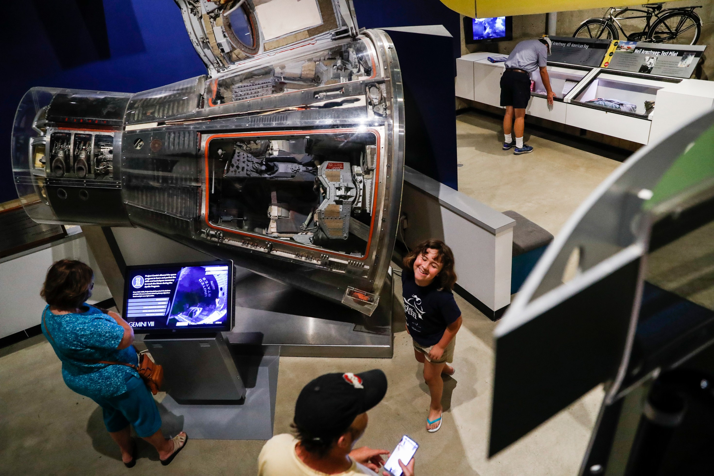 Visitors browse an exhibit featuring the Gemini VIII spacecraft at the Armstrong Air & Space Museum, Wednesday, June 26, 2019, in Wapakoneta, Ohio. Neil Armstrong helped put Wapakoneta on the map July 20, 1969, when he became the first human to walk on the moon. The late astronaut remains larger than life in the city 60 miles (96.56 kilometers) north of Dayton, where visitors are greeted by the space base-shaped top of the space museum named for him as they exit Interstate 75. (AP Photo/John Minchillo)
