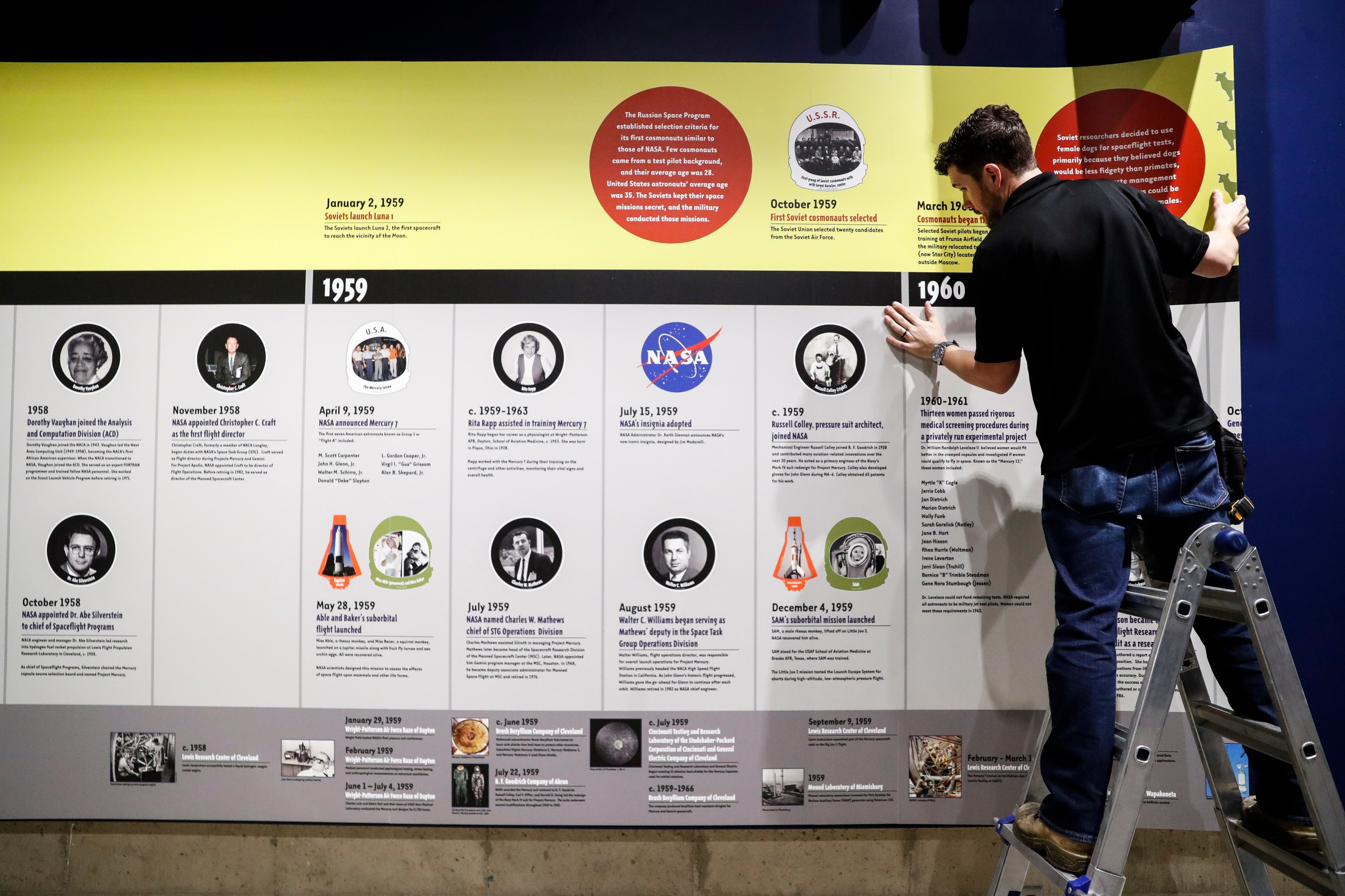A workman prepares a display at the Armstrong Air & Space Museum, Wednesday, June 26, 2019, in Wapakoneta, Ohio. Very down to earth about most things, folks in this small western Ohio city are over the moon as they get ready to celebrate the 50th anniversary of the day they watched their hometown hero along with the world. Neil Armstrong put Wapakoneta on the map in July 1969 when he became the first human to walk on the moon. (AP Photo/John Minchillo)