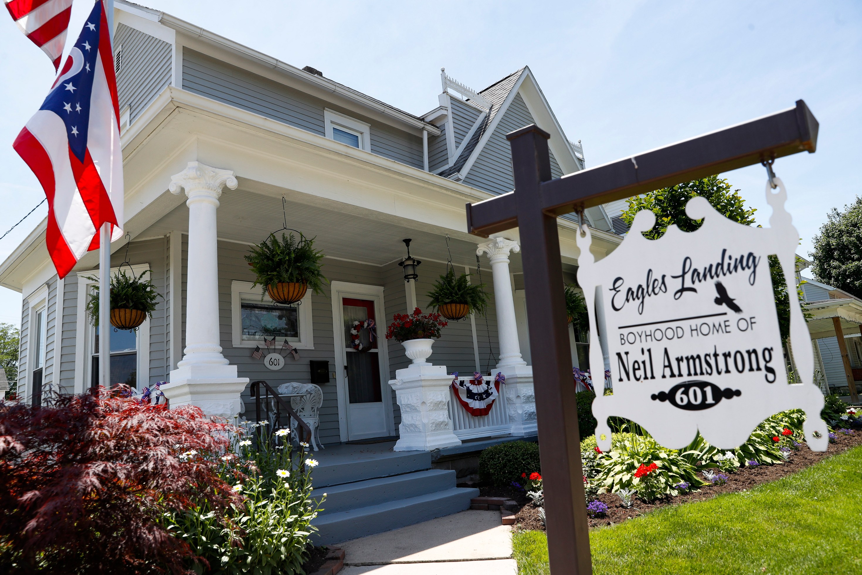 The boyhood home of astronaut Neil Armstrong is commemorated by a sign on its front yard, Wednesday, June 26, 2019, in Wapakoneta, Ohio. Very down to earth about most things, folks in this small western Ohio city are over the moon as they get ready to celebrate the 50th anniversary of the day they watched their hometown hero along with the world. Neil Armstrong put Wapakoneta on the map in July 1969 when he became the first human to walk on the moon. (AP Photo/John Minchillo)